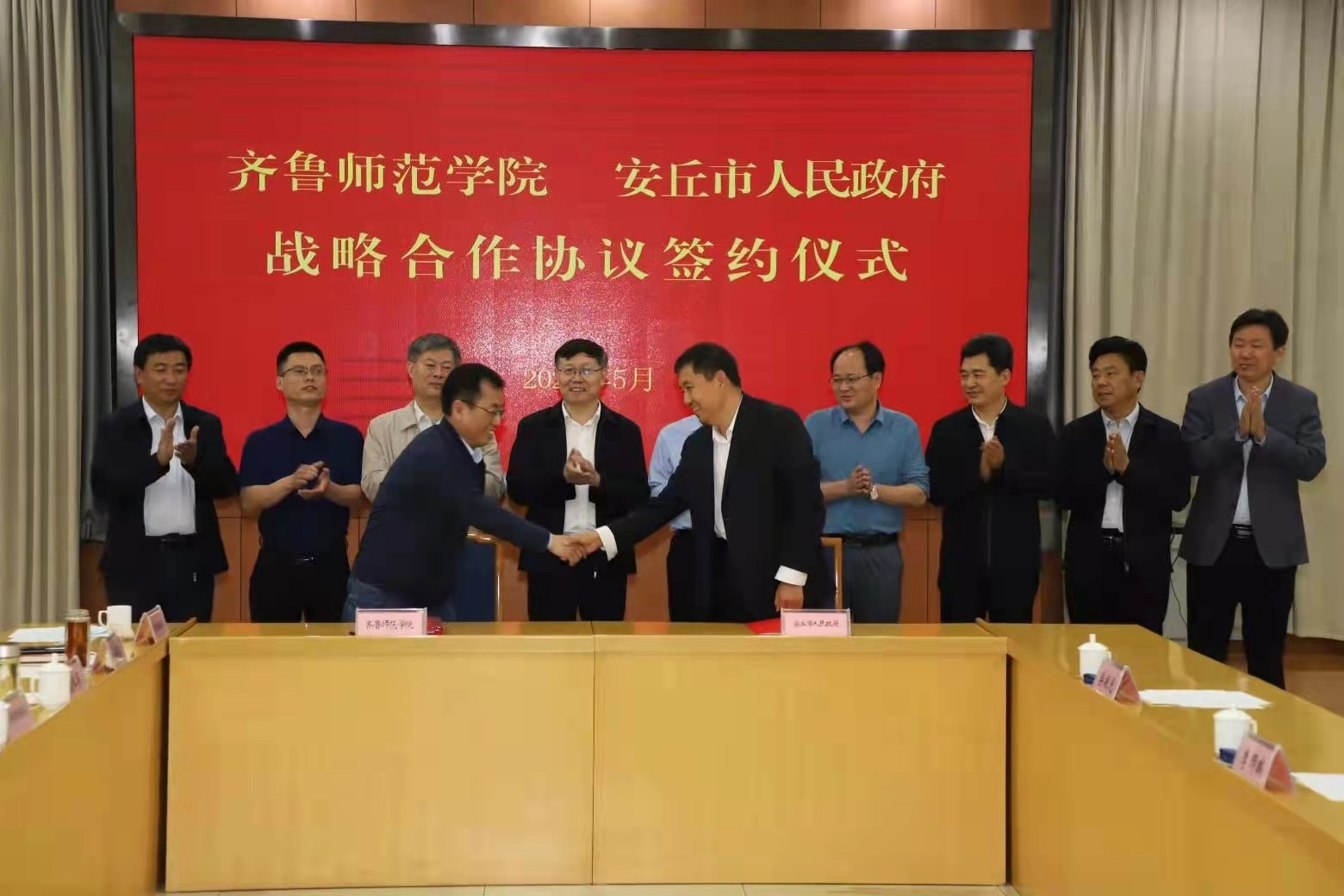 2021年5月21日上午,我校与安丘市人民政府战略合作框架协议签约仪式在安丘市级机关综合办公大楼一楼第二会议室隆重举行。安丘市委副书记、市长贾勤清,市委常委、统战部部长冷文清,市委组织部分管负责人,市应急管理局、财政局、综合性执法局、发改局、教体局、科技局、人社局、农业农村局、环卫园林科技集团主要负责人,齐鲁师范学院党委副书记、校长林松柏,科研处处长(合作发展办公室主任)魏培海,生命科学学院院长李师鹏、副院长崔大勇出席了签约仪式。签约仪式由贾勤清主持。