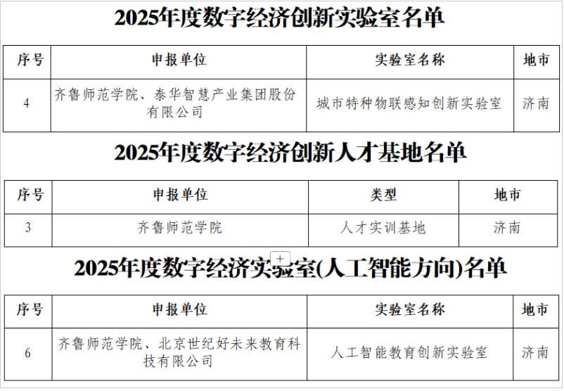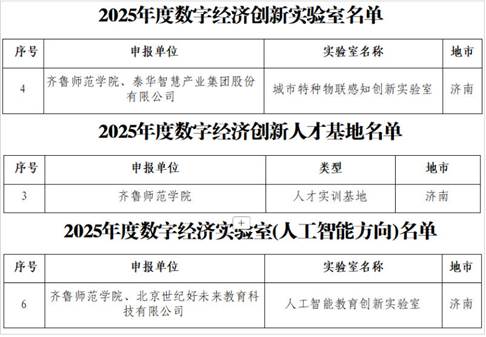 近日,山东省工业和信息化厅公布了2025年度山东省数字经济创新平台名单,我校申报的城市特种物联感知创新实验室、人才实训基地和人工智能教育创新实验室三个平台成功入选。这标志我校在服务山东数字经济高质量发展、推动相关领域科技创新与人才培养方面取得了重要突破。