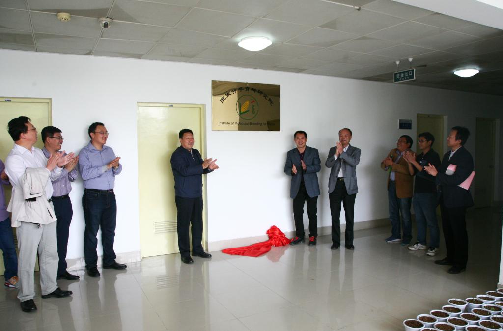 最后,全体与会人员来到玉米分子育种研究院门前,在各位领导、专家、学者及部分学生代表的共同见证下,王玉华校长、王晓举书记、高新勇总裁共同为“玉米分子育种研究院”揭牌。揭牌仪式现场,气氛热烈,掌声不断。