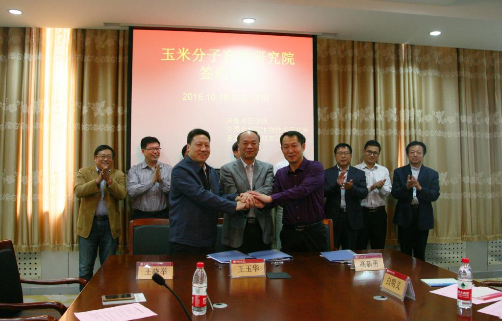 2016年10月18日,我校在图书馆四楼会议室隆重举行玉米分子育种研究院签约、揭牌仪式。中国农业科学院生物技术研究所党委书记、副所长王晓举,副所长张春义,圣丰种业科技有限公司总裁高新勇,研发总监韩宗礼,齐鲁师范学院党委副书记、校长王玉华,校长办公室、科研处、人事处、实验管理中心、生命科学学院、玉米分子育种研究院等部门负责同志及来自山东大学、中国科学院青岛生物能源与过程研究所、山东农业大学的专家、学者共计30余人参加了签约、揭牌仪式。仪式由王玉华校长主持。