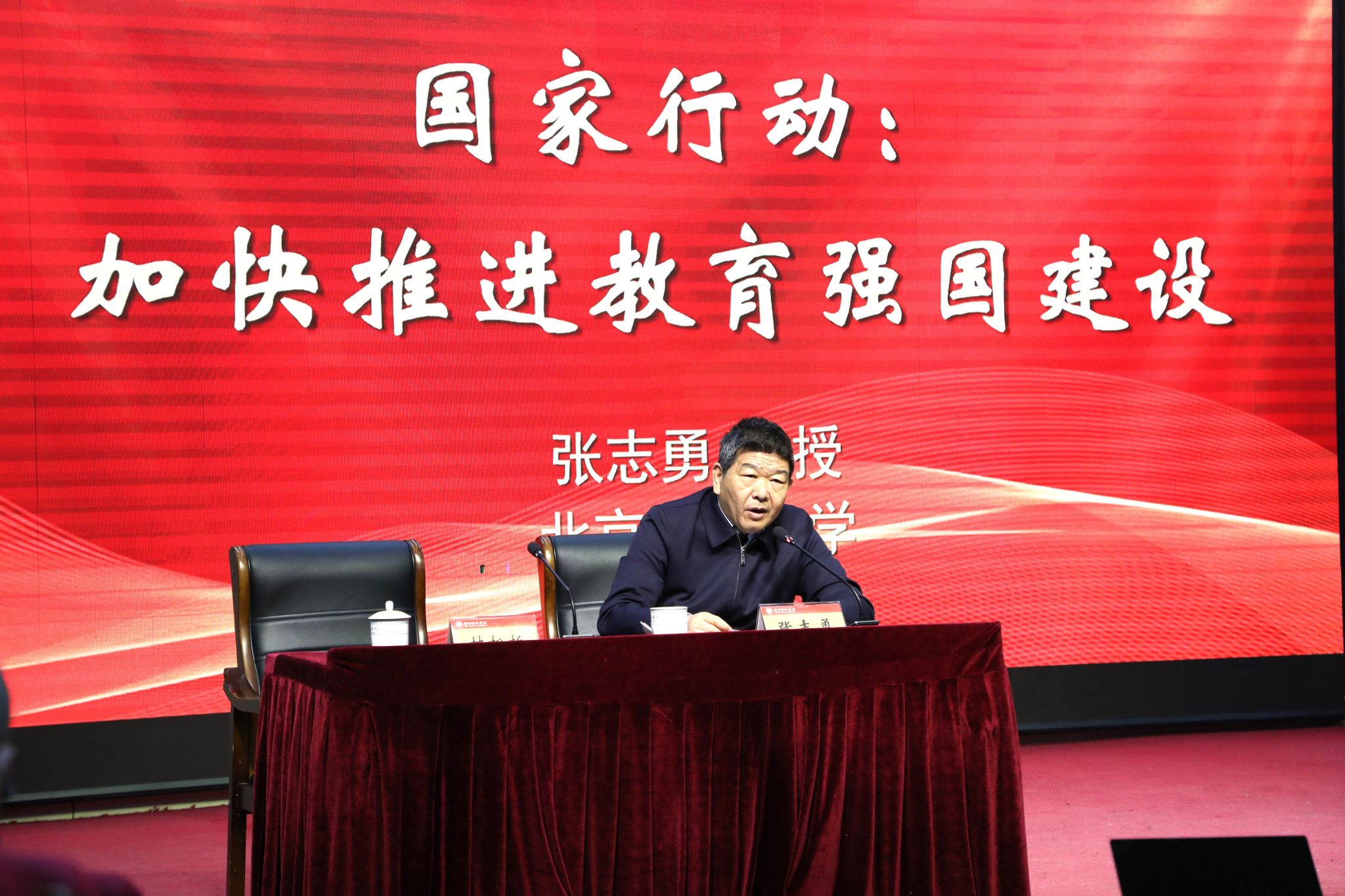 开幕式后,北京师范大学教授、国家高端智库教育国情调查中心主任张志勇教授受邀作题为《国家行动:加快推进教育强国建设》的专家辅导报告。张志勇教授深刻分析了当前我国的教育现状,从教育强国建设的主题、主要任务、体制建设、战略支撑等四个方面深入浅出的为与会人员带来了一场高屋建瓴、视角新颖的学术盛宴。