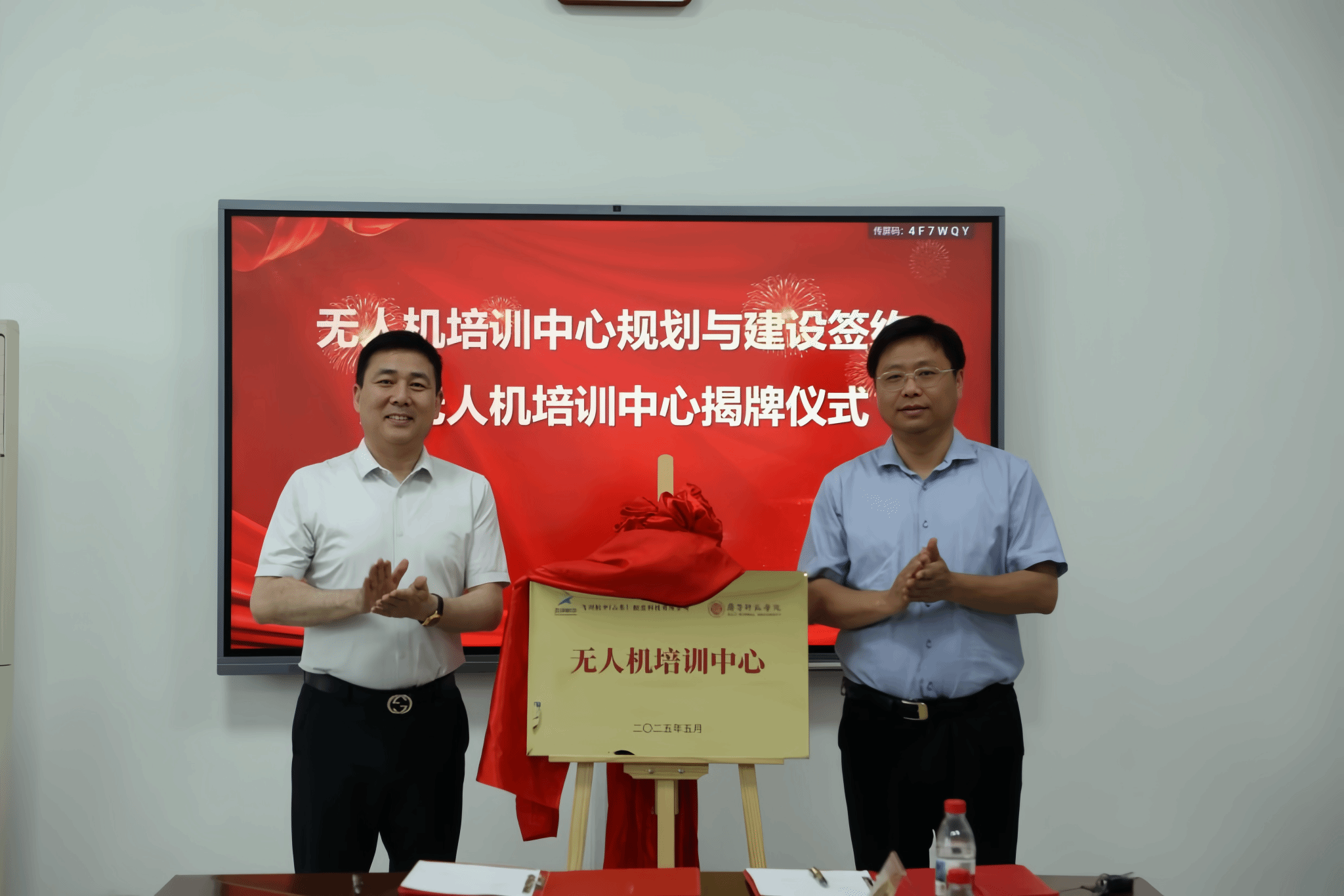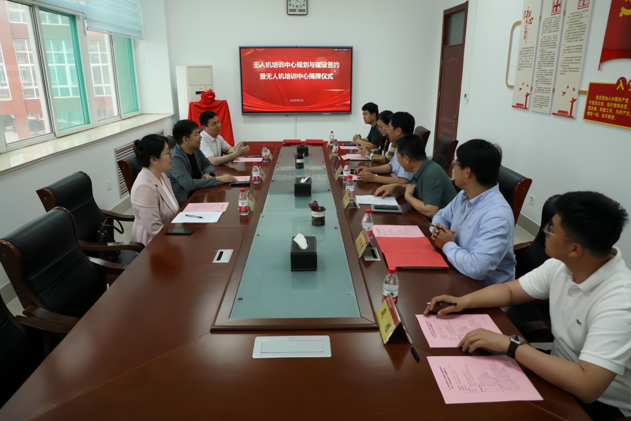 彭运新、郑秀文为无人机培训中心揭牌,孙萍、张洁签署了《无人机培训中心规划与建设技术开发合同》。刘书志博士介绍了齐鲁师范学院与飞训航中(山东)航空科技有限公司联合建设无人机培训中心的工作方案。
