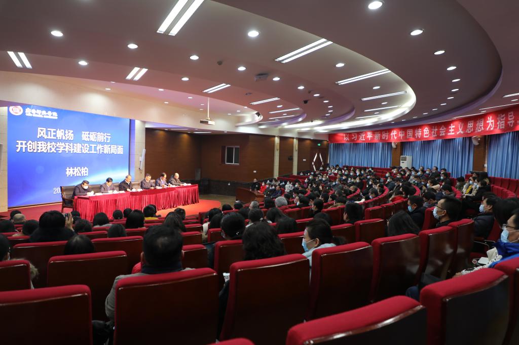 林松柏作了题为“风正帆扬,砥砺前行,开创我校学科建设工作新局面”的主题报告。报告从重点学科、科研平台、科研成果、学科队伍、服务社会能力、学术氛围、科研管理等七个方面对“十三五”时期的学科建设进行了回顾和总结,并结合我校建设高水平应用型学科本科院校的战略目标指出学科布局、高层次科研成果、学科队伍、高层次科研平台和应用型科学研究等方面的不足和出现的问题,并对“十四五”时期学科建设的总体目标和主要任务做出了具体部署。