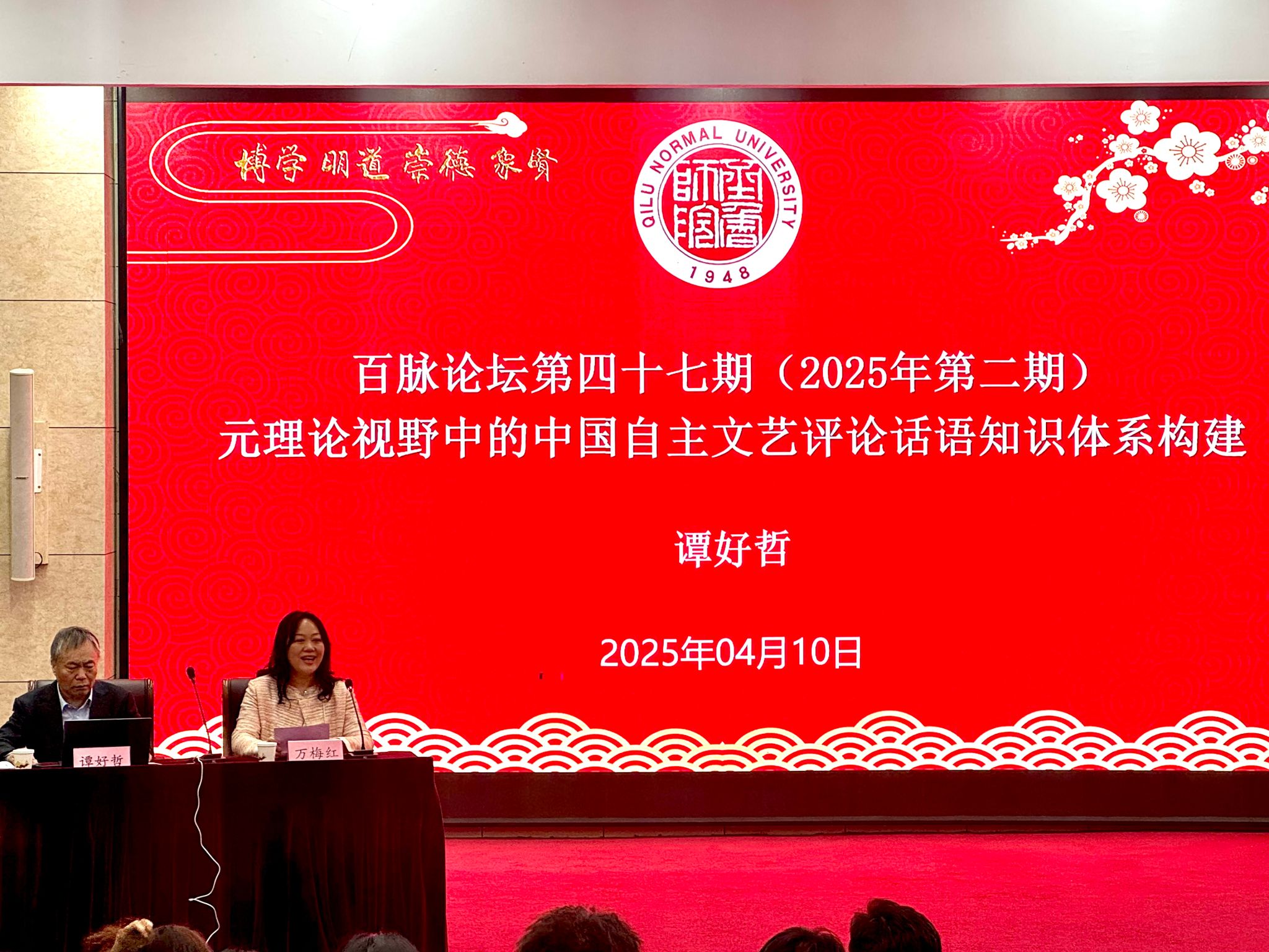 为推动教育教学改革,探索教育教学新模式,提升教师综合能力素养,4月10日下午,由科研处主办、音乐学院承办的2025年第2期“百脉论坛”讲座在章丘校区第一学术报告厅举行。山东大学二级教授、博士生导师谭好哲受邀到校作题为《元理论视野中的中国自主文艺评论话语知识体系构建》的学术报告。音乐学院院长万梅红主持报告会,音乐学院全体教师及部分学生近200人聆听报告。