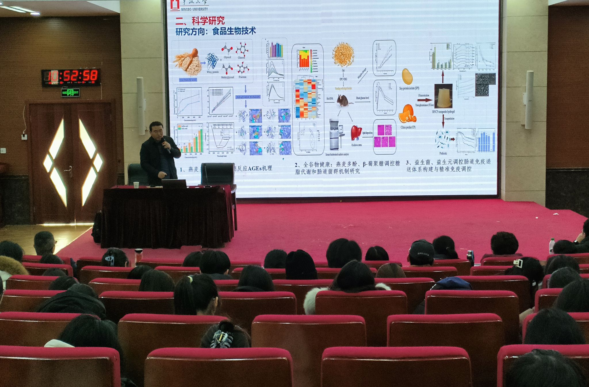 刘连亮重点围绕全谷物成分,深入探讨了燕麦酚类化合物(OPC)和燕麦β-葡聚糖(OBG)对代谢综合征和肠道菌群的调控作用。通过其团队的研究成果,对OPC和/或OBG在调节血清和肝脏脂质水平、调节肠道菌群结构表型和抑制美拉德反应AGEs的生成等方面的调控机制进行详细介绍,为全谷物膳食预防高脂血症等代谢综合征提供解释和支撑,也为燕麦酚类化合物抑制糖基化提供基础。报告后,他分享了自己的科研经历,与师生进行了深入交流,并耐心解答了大家的问题。
