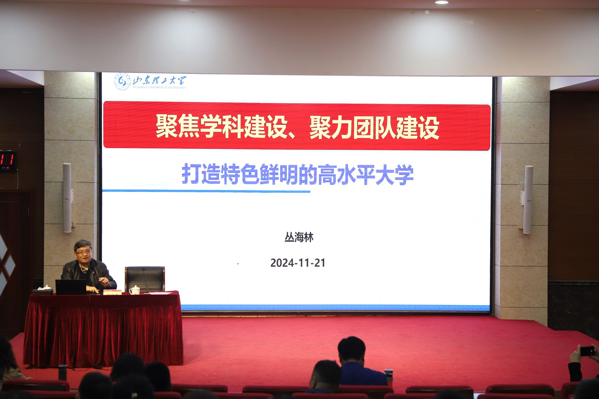 丛教授结合山东理工大学办学实践以及自身多年丰富的管理和建设经验,主要从聚焦学科建设、聚力团队建设以及未来五年规划等3个方面,深刻阐释了学科建设、团队建设、特色建设对学校高质量发展的重要性,并就推进特色鲜明的高水平大学建设和硕士学位立项建设单位建设提出可行性建议。