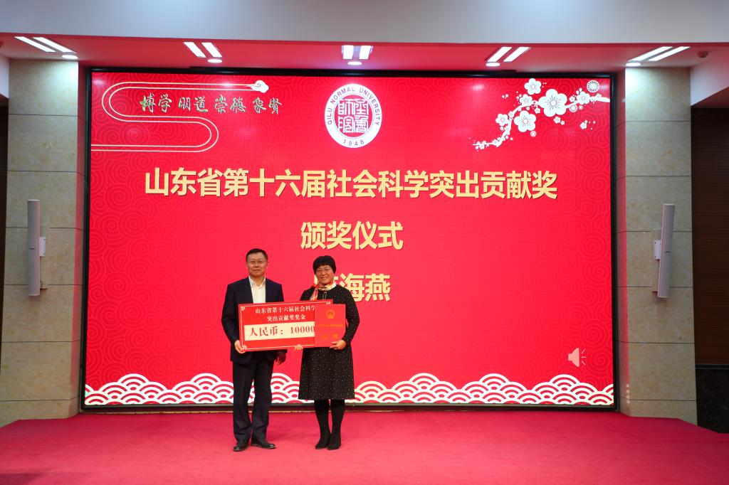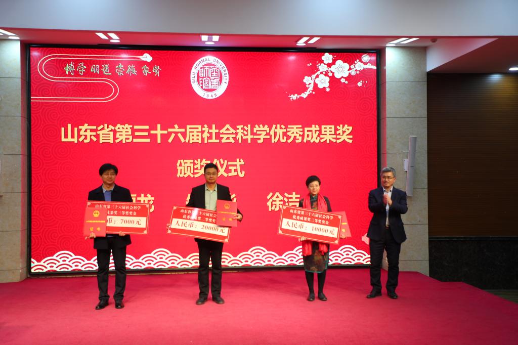 表彰大会现场,张兆明为山东省第三十六届社会科学优秀成果奖二等奖获得者朱振华教授、山东省第三十六届社会科学优秀成果奖三等奖获得者徐洁教授、贾龙教授颁奖;林松柏为山东省第十六届社会科学突出贡献奖获得者陈海燕教授颁奖。