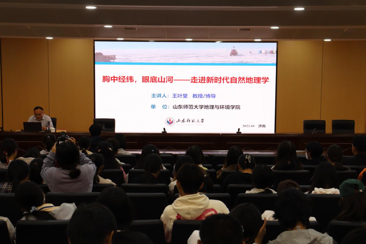 报告会上,王叶堂从地理学的发展阶段、自然地理学的学科体系与研究内容、新时代自然地理学研究的前沿领域、新时代自然地理学的发展趋势四大方面,对新时代的自然地理学进行了系统的梳理和阐释,与老师和同学们交流了自然地理学的新思想,探讨了自然地理学研究的新方法、新方向。