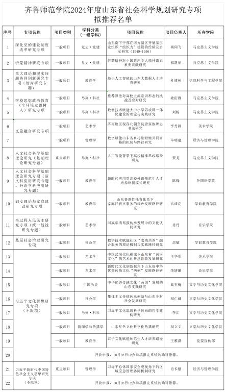 齐鲁师范学院2024年度山东省社会科学规划研究专项拟推荐名单公示