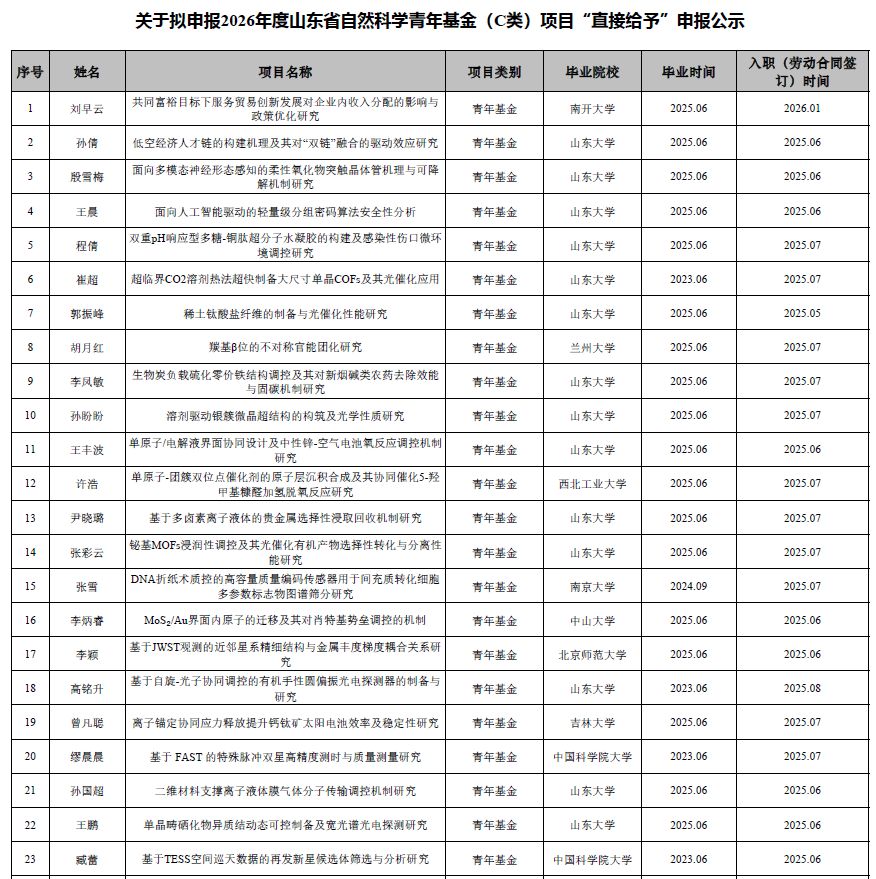 按照山东省科学技术厅《山东省自然科学基金项目管理办法》《关于集中申报2026年度山东省自然科学基金项目的通知》要求,现对我校拟申报2026年度山东省自然科学青年基金(C类)“直接给予”项目进行公示。
